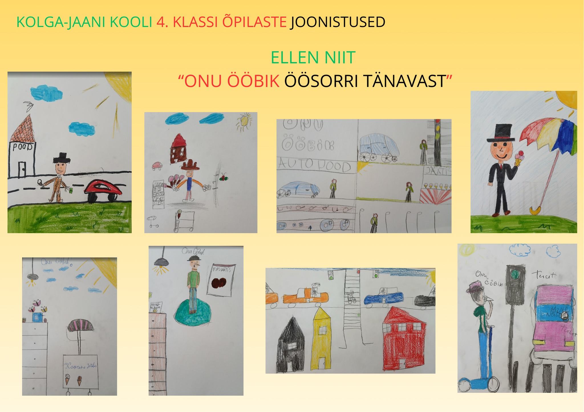 Eesti Lastekirjanduse Keskus ja Eesti Keele Instituut korraldasid täna üleilmset eesti kirjanduse kooslugemise päeva. Sel aastal valiti ühiseks lugemisvaraks Ellen Niidu raamat „Onu ööbik Öösorri tänavast“. Vahvaid lugusid raamatust lugesid nii 2. kui ka 4. klassi õpilased. Loetud lugudest sündisid toredad joonistused. Igaüks võib ise pildi põhjal arvata, mis looga tegu on.