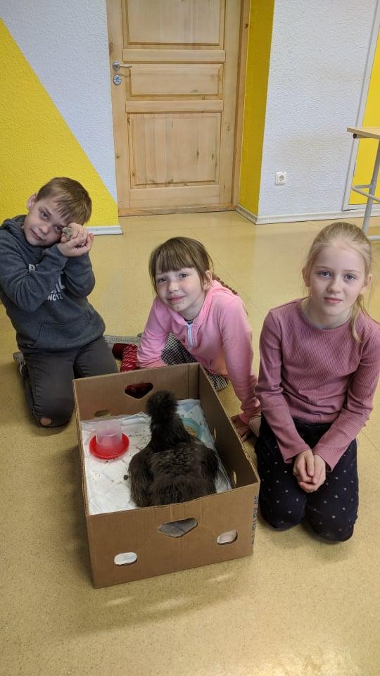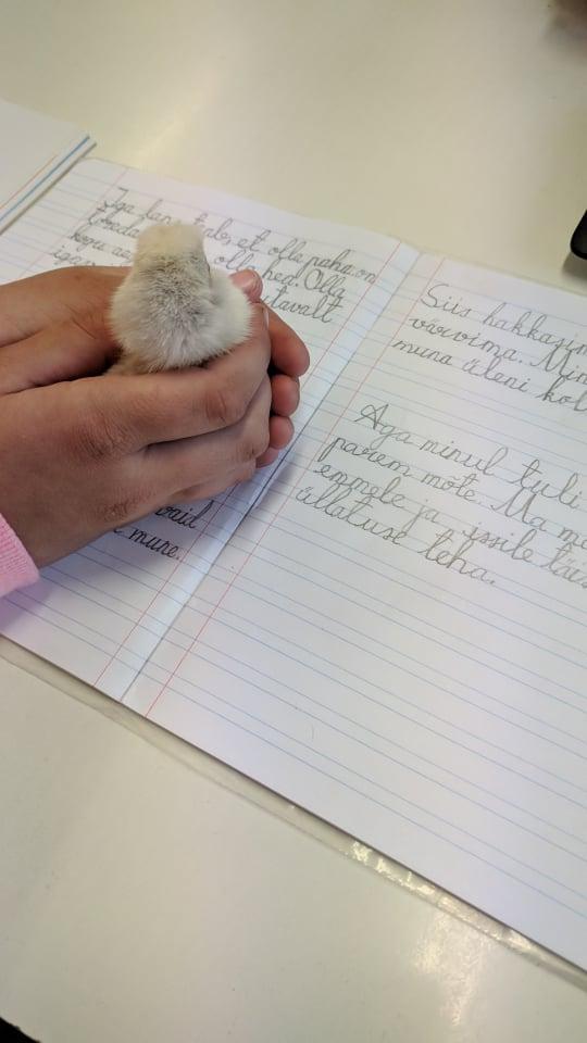õp Inga tuli 14.04 koolimajja suure kastiga. Kastis oli siidikana viie imearmsa tibuga, kes kogu koolipäeva paitustele ja nunnutamisele vastu pidasid ning kõigile suurt rõõmu pakkusid. Õpetaja Inga rääkis lastele lihavõtetest ja sellest, kuidas munast saab tibu ning lisaks erinevatest kanatõugudest.