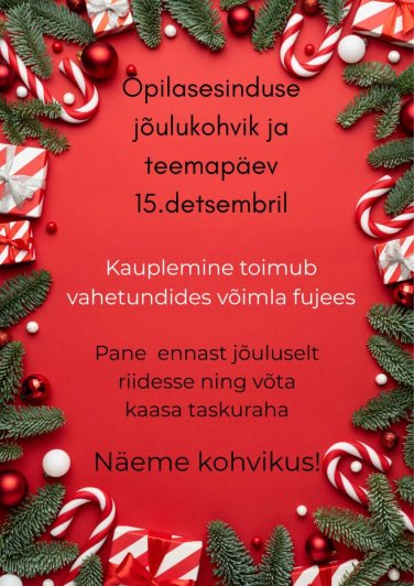 Aeg 08:00 - 13:00 Asukoht Võimla fuajees Sündmus Ava foto Vaata rohkem sündmusi Ava foto Avaldatud 11.12.2025. Viimati muudetud 11.12.2025.
