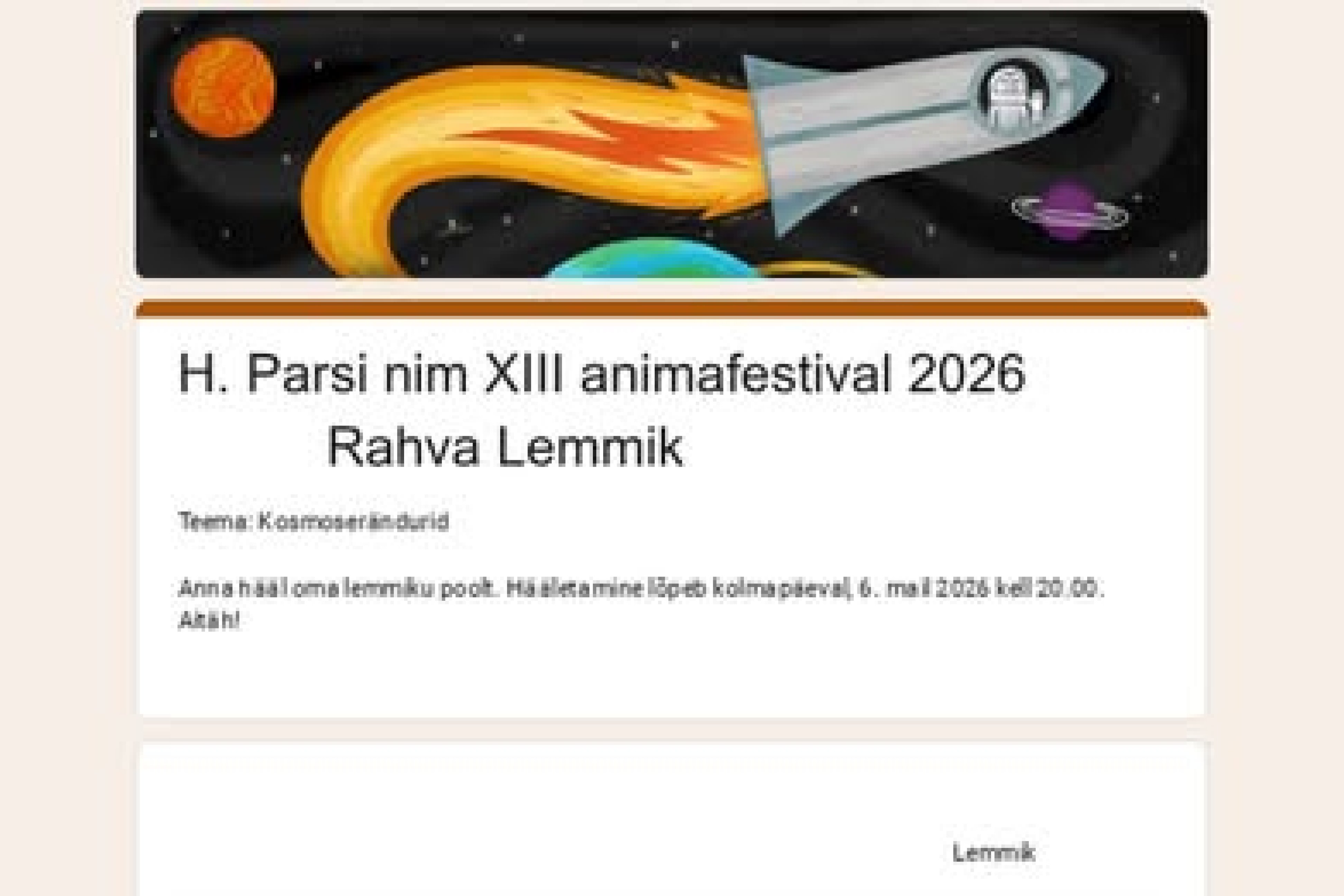 Filmid on vaatamiseks ja Rahva Lemmiku valimiseks näha siin: https://forms.gle/EoHvi3rpNztm78AcAlink opens on new page